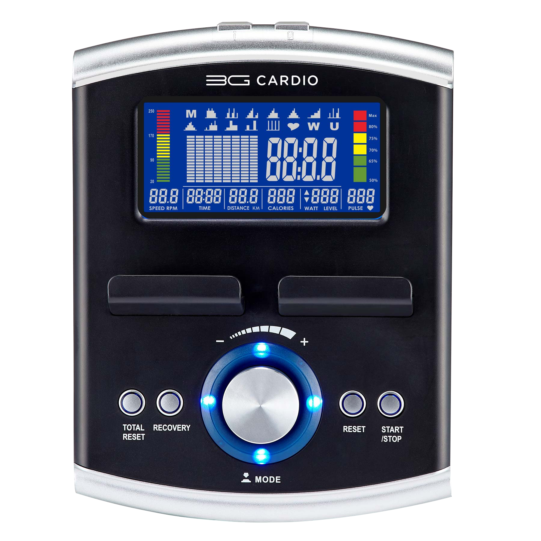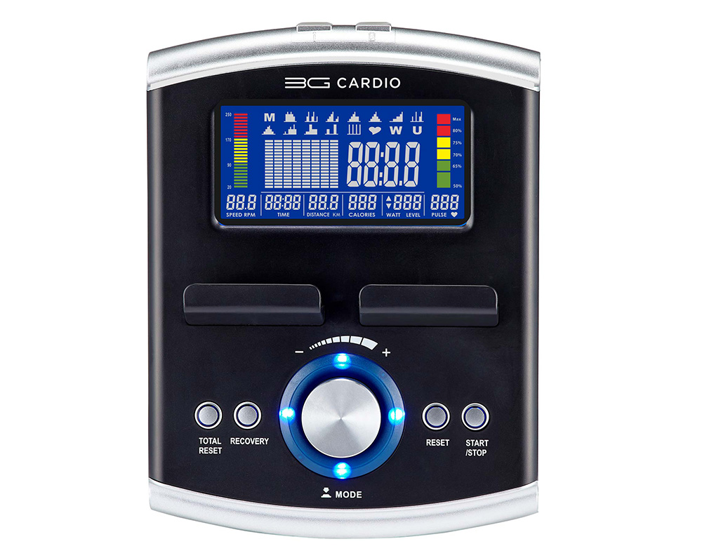 - LCD readouts: SPEED, RPM, TIME, DISTANCE, CALORIES, WATT, LEVEL, PULSE
