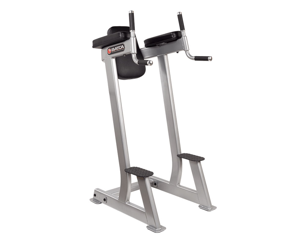 The Batca FZ-9 Vertical Knee Raise Dip has an angled back pad, which comfortably cradles the user during exercise and allows strict muscle targeting.