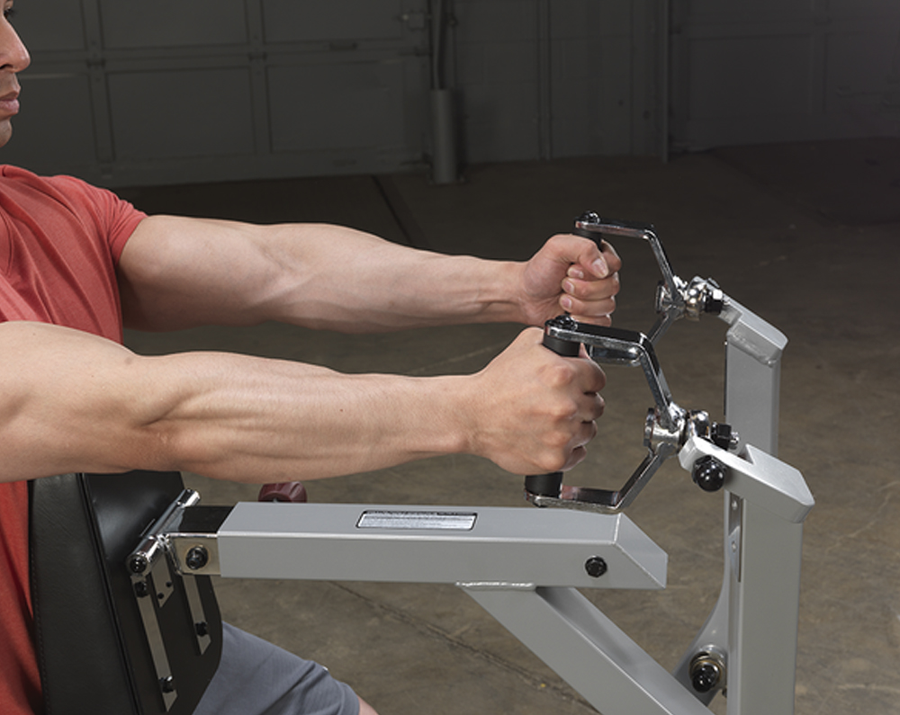 - Gas assisted chest support for various arm lengths and total isolation of back muscles
