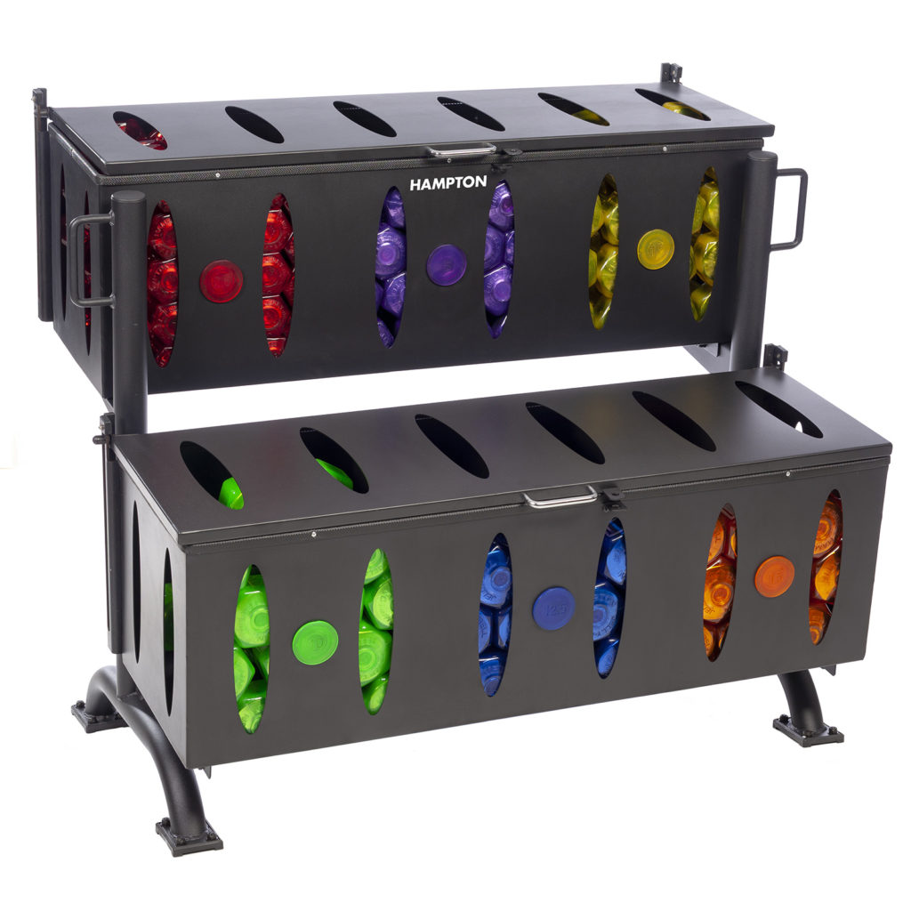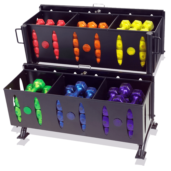 The NEW Hampton Jelly-Bell Urethane Aerobic Dumbbell Club Pack – Jelly Bell Urethane Dumbbells have superior durability compared to neoprene and vinyl dumbbells. Jelly Bell dumbbells are sleek and stylish as well as convenient, comfortable and colorful. Jelly Bell dumbbells are brightening the landscape of group fitness and are made of a highly durable urethane. Jelly Bell dumbbells come in 2.5 lb. increments from 2.5 lb. to 15 lbs., and half sizes are color-coded for easy identification. The unique Hampton Jelly-Bell Urethane Aerobic Dumbbell Club Pack bin-style racking system is both portable and lockable.