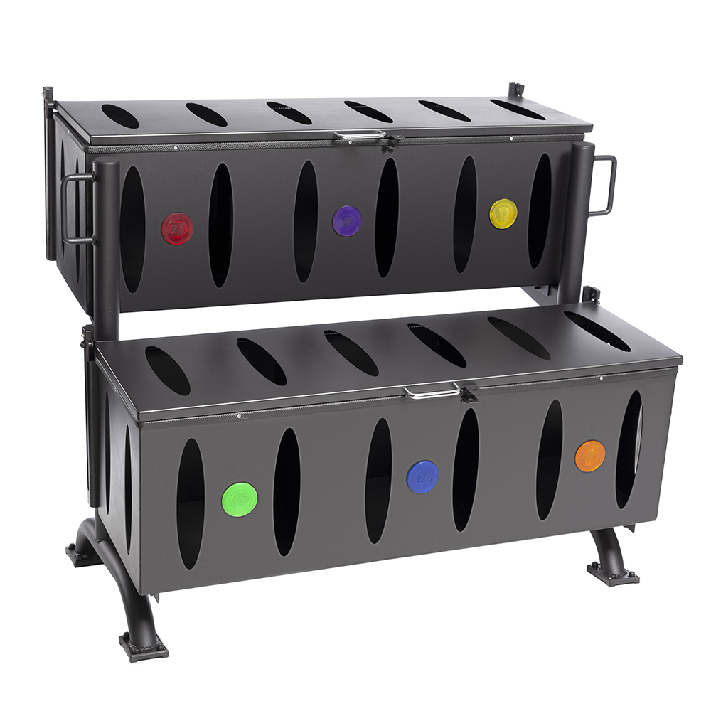 Jelly-Bell® Club Pack | 44 Pairs: (12) 2.5 LB / (10) 5 LB / (8) 7.5 LB / (6) 10 LB / (4) 12.5 LB / (4) 15 LB | Includes: 2-Tiered, 6-compartment Jelly Bell® Rack — Casters NOT INCLUDED