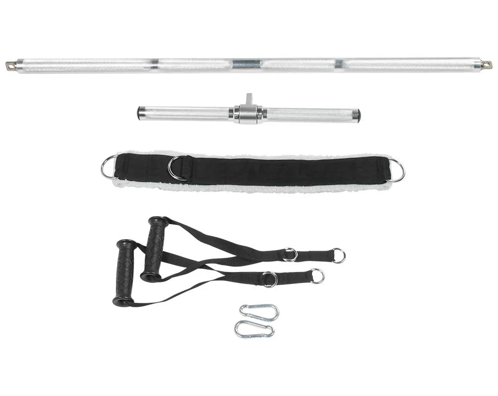 - Comes standard with two (2) Strap Handles, Padded Ankle/Thigh Strap, Aluminum Curl Bar, Dual-Attachment Aluminum Long Bar, Dual-Attachment Long Strap