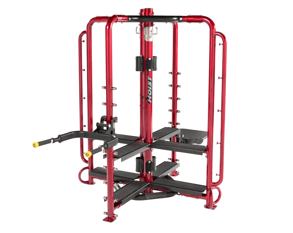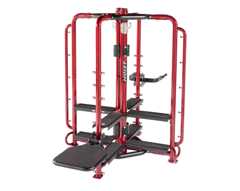 The Hoist Fitness MotionCage Studio Package 1 MCS-8001 is a series of functional training system exercise stations that can be configured in several ways to best suit your layout and needs. Configurations can include a Squat Rack, a Renegade Station, Dual Hi-Lo Pulleys, a Boxing Station, a Rebounder Station, a Wall Target Station, and more — all with integrated accessory hooks for bands and resistance straps storage, and shelving for kettle bells and medicine balls. A sleek design and colorful finish invites those wanting to be their best to jump on and “Start a ComMOTION”.