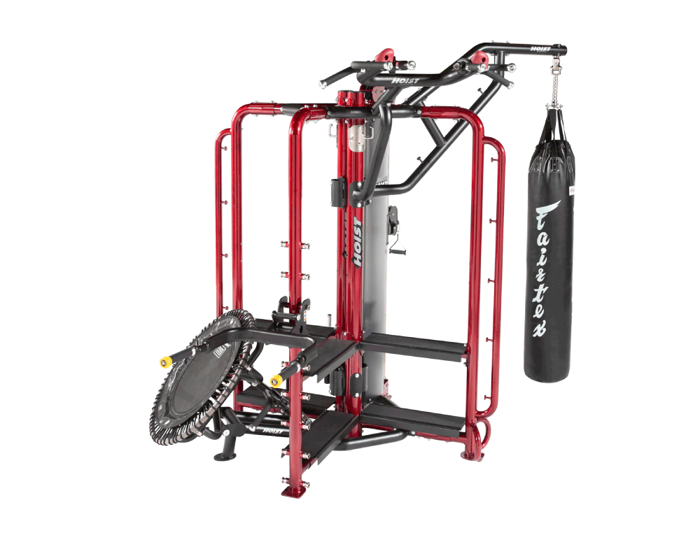 The Hoist Fitness MotionCage Studio Package 3 MCS-8003 is a series of functional training system exercise stations that can be configured in several ways to best suit any facility’s layout and needs. Configurations can include a Squat Rack, a Renegade Station, Dual Hi-Lo Pulleys, a Boxing Station, a Rebounder Station, a Wall Target Station, and more — all with integrated accessory hooks for bands and resistance straps storage, and shelving for kettle bells and medicine balls. Fitness trainers can train individuals or entire classes on the MotionCage system. A sleek design and colorful finish invites gym-goers to jump on and “Start a ComMOTION”.