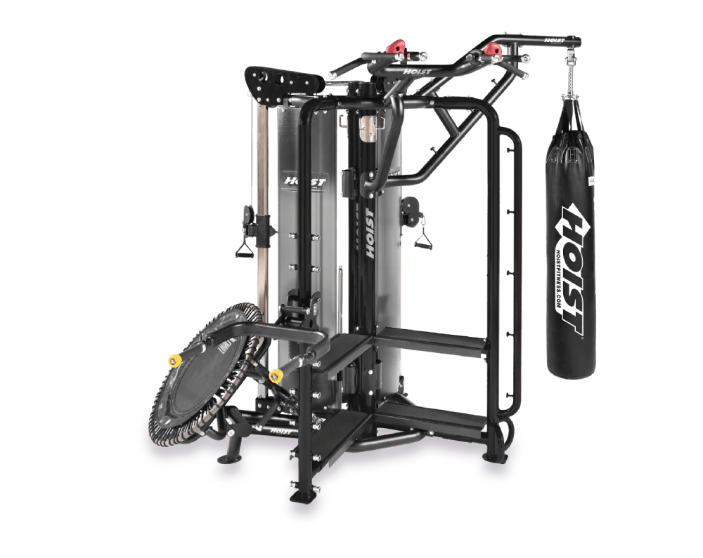 The Hoist Fitness MotionCage Studio Package 4 MCS-8004 is a series of functional training system exercise stations that can be configured in several ways to best suit any facility’s layout and needs. Configurations can include a Squat Rack, a Renegade Station, Dual Hi-Lo Pulleys, a Boxing Station, a Rebounder Station, a Wall Target Station, and more — all with integrated accessory hooks for bands and resistance straps storage, and shelving for kettle bells and medicine balls. Fitness trainers can train individuals or entire classes on the MotionCage system. A sleek design and colorful finish invites gym-goers to jump on and “Start a ComMOTION”.