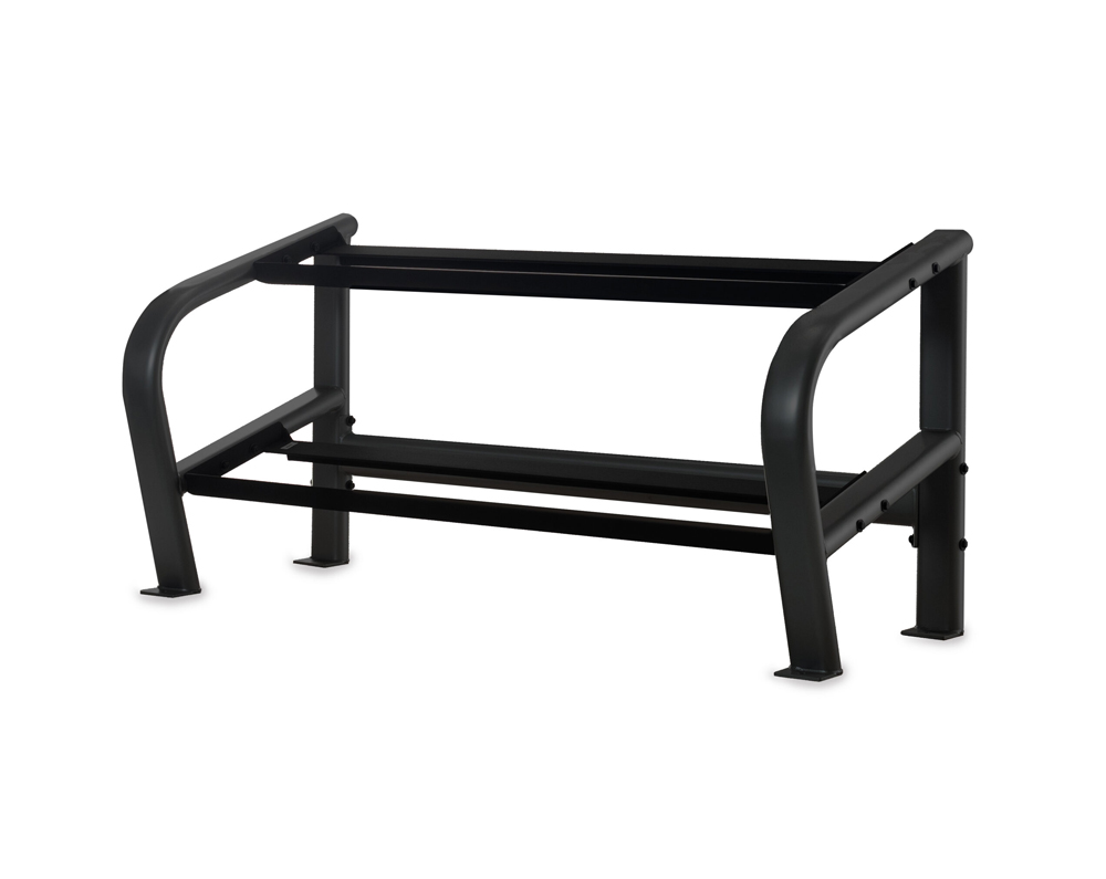 - The two heavy duty tray shelves of Inflight 65″ 2-Tier Dumbbell Rack are properly spaced and angled for the easy removal and storage of a variety of dumbbells or kettle bells.