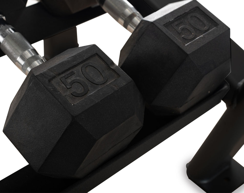 - Holds ten pair of 5lb to 50lb hex dumbbells.