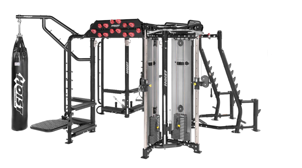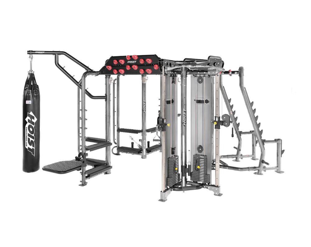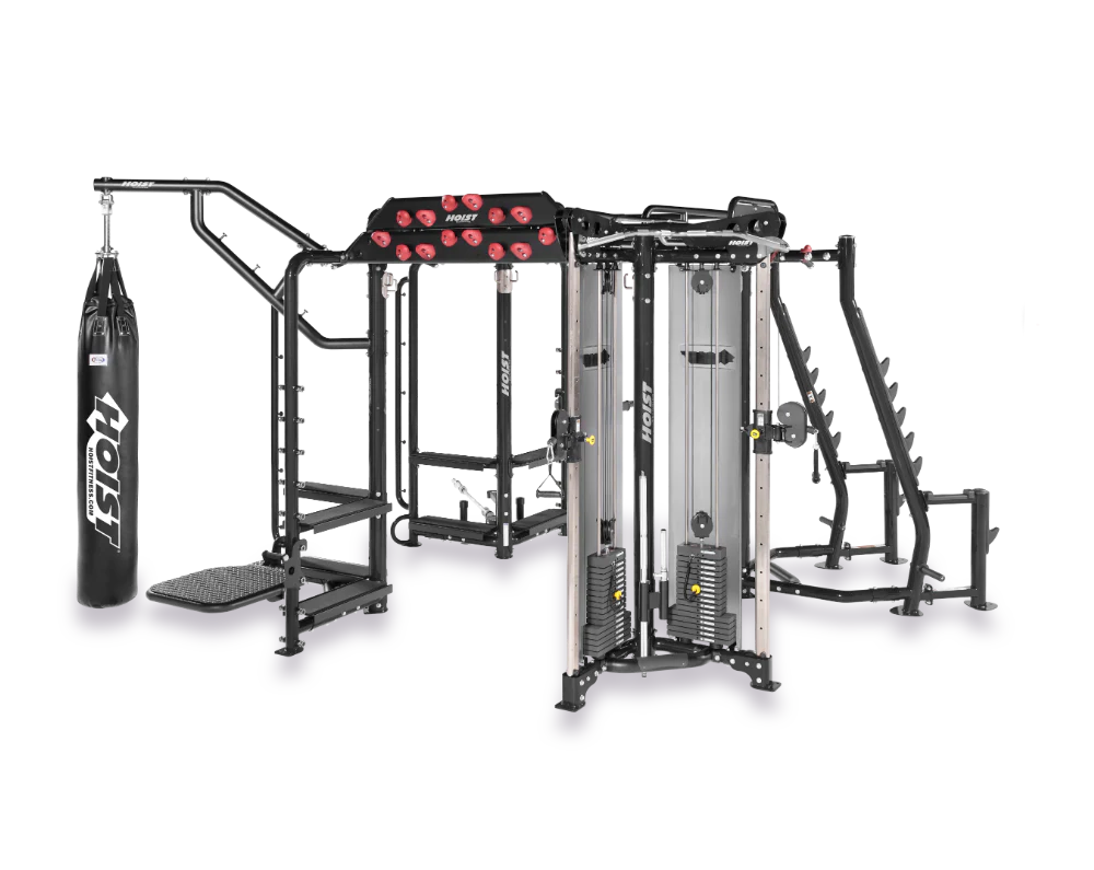 The Hoist Fitness MotionCage Package 4 MC-7004 is a series of functional training system exercise stations that can be configured in several ways to best suit any facility’s layout and needs. Configurations can include a Squat Rack, a Renegade Station, Dual Hi-Lo Pulleys, a Boxing Station, a Rebounder Station, a Wall Target Station, and more — all with integrated accessory hooks for bands and resistance straps storage, and shelving for kettle bells and medicine balls. Fitness trainers can train individuals or entire classes on the MotionCage system. A sleek design and colorful finish invites gym-goers to jump on and “Start a ComMOTION”.