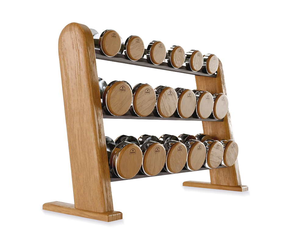 NOHRD DumbBells come paired with our space-saving, solid wood storage rack, sure to become a focal point in any gym space. The DumbBell diameters remain uniform across weight ranges, ensuring a streamlined look and seamless weight transitions. The angled wood frame is designed for maximized stability and organized convenience for your training session.