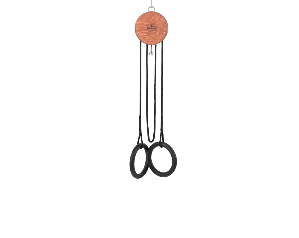 The Sling features two sturdy wooden gymnastic rings that serve as handles or foot supports depending on the specific exercise. Durable braided ropes suspend these rings, reminiscent of those used in mountain climbing, ensuring safety and reliability.