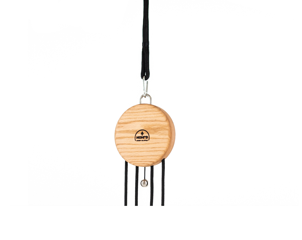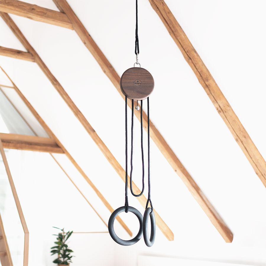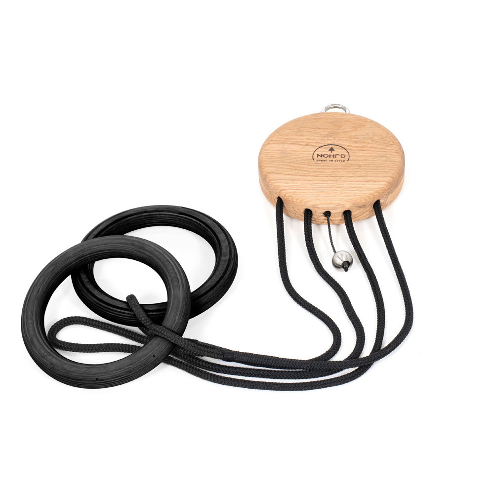 The solid oak housing of the quick-adjust mechanism, paired with the 24 cm diameter black-stained ring, gives the NOHRD Sling suspension trainer a natural touch and feel. The Sling can be easily attached to the ceiling or a tree branch by the included carabiner.