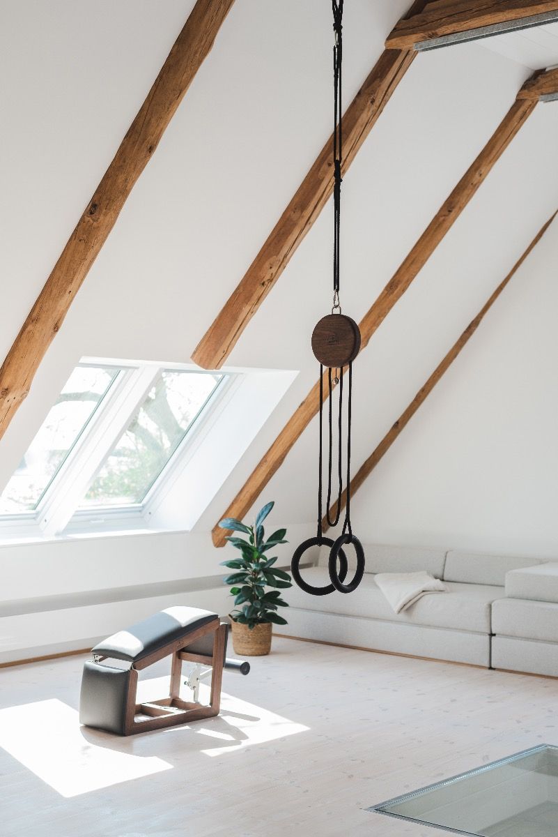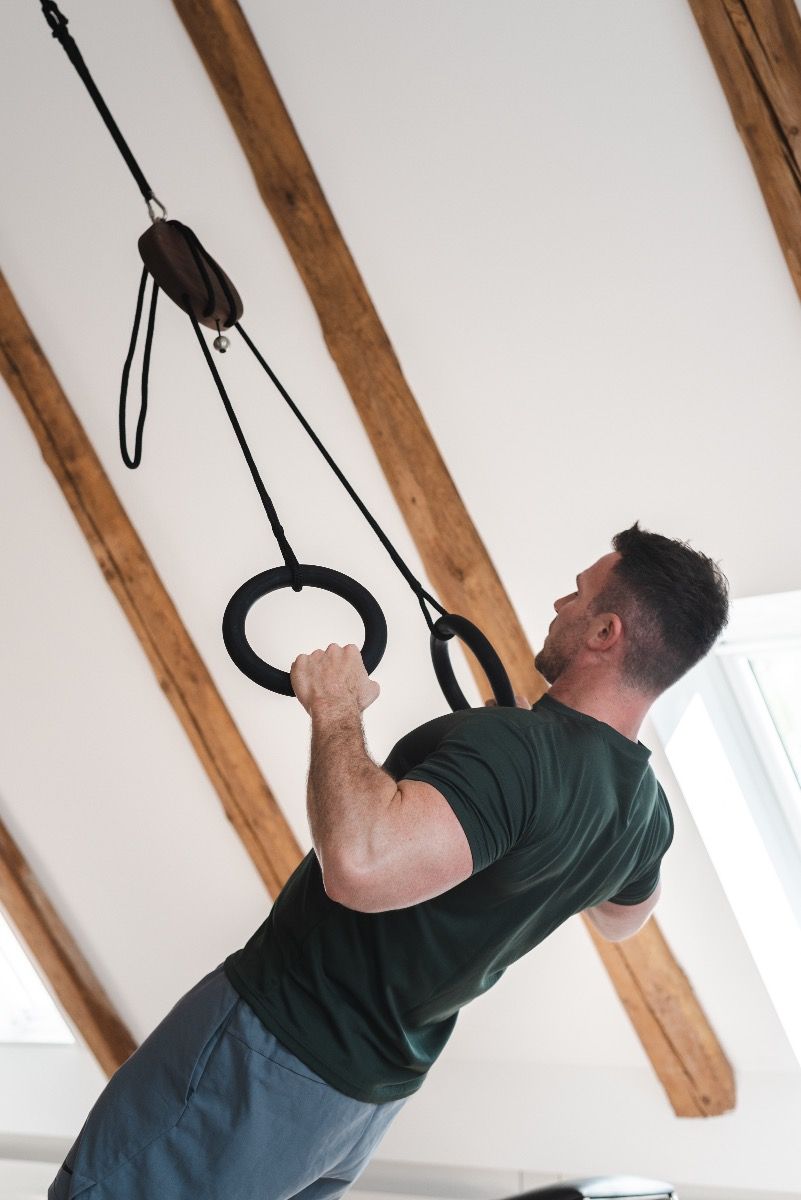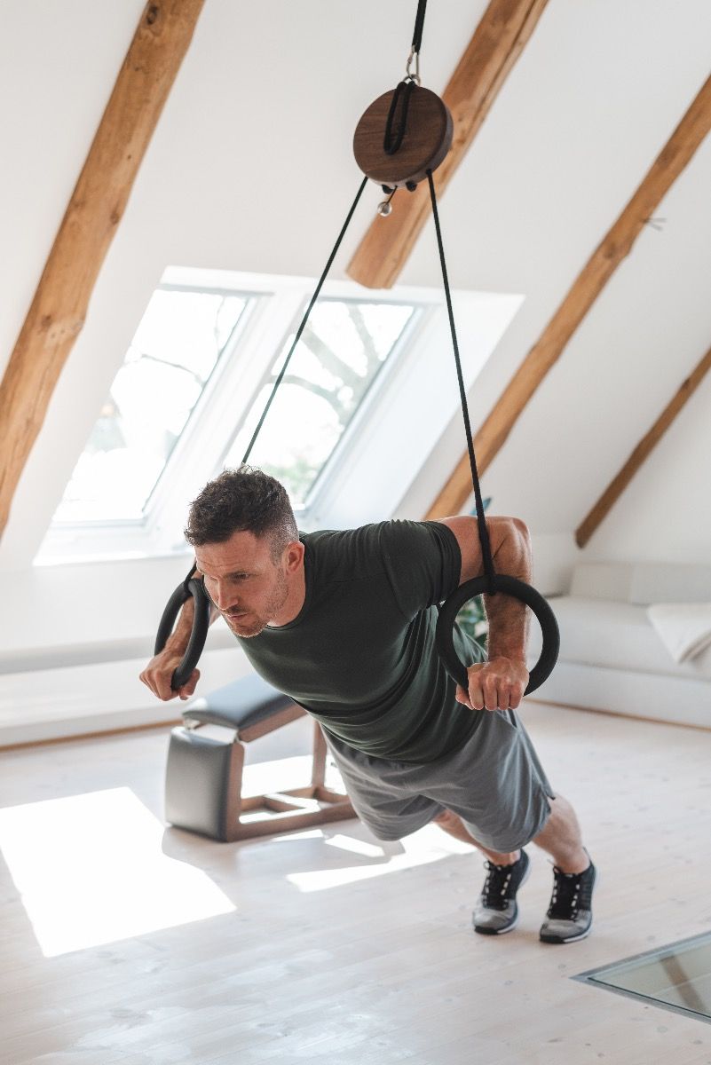 The Sling features two sturdy wooden gymnastic rings that serve as handles or foot supports depending on the specific exercise. Durable braided ropes suspend these rings, reminiscent of those used in mountain climbing, ensuring safety and reliability.