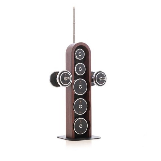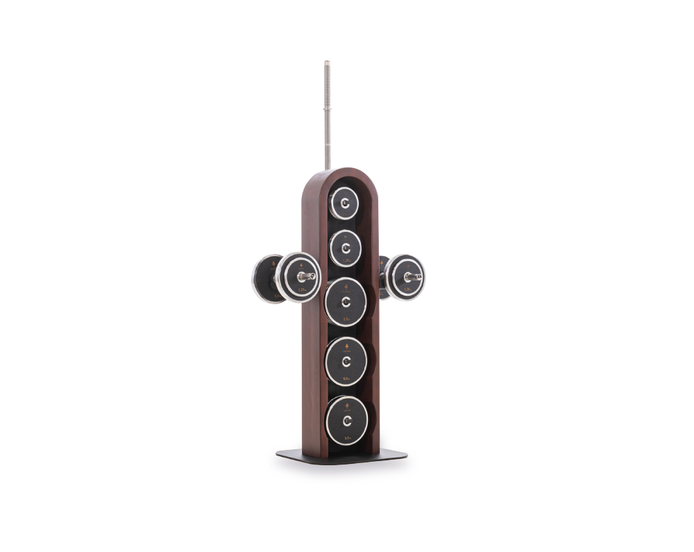 A statement piece for your fitness space. The WeightPlate Tower is available in our full range of sustainable hardwoods and neatly holds individual WeightPlates. The two shorter Dumbell Barbells are stored in the side holders, while the Long Barbell is secured vertically behind the Tower.