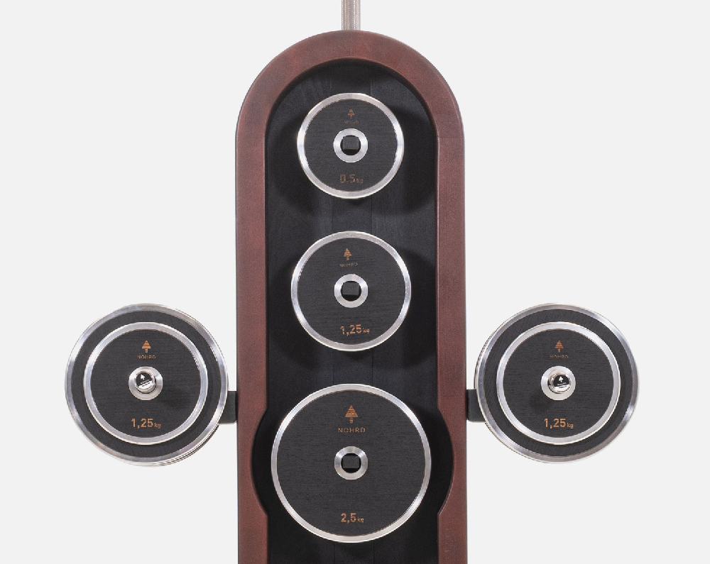 A combination of premium wood and metal, the NOHRD WeightPlate Tower Club is a solid wood and steel weight rack with individual WeightPlates, a Long Barbell, and two shorter Dumbbell Barbells. Beautifully designed and built to last, the WeightPlater Tower is a compact and versatile piece of strength training equipment. An update on conventional weight plates and bars, WeightPlate Tower bars have an integrated SlideLock™ System that holds the WeightPlates in place and removes the need for cumbersome clips or collars.