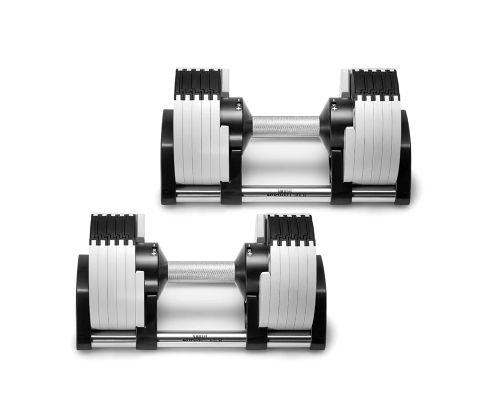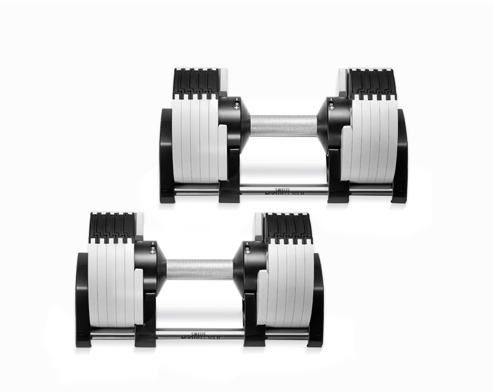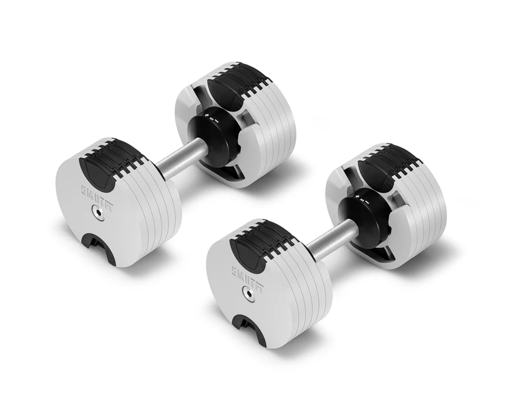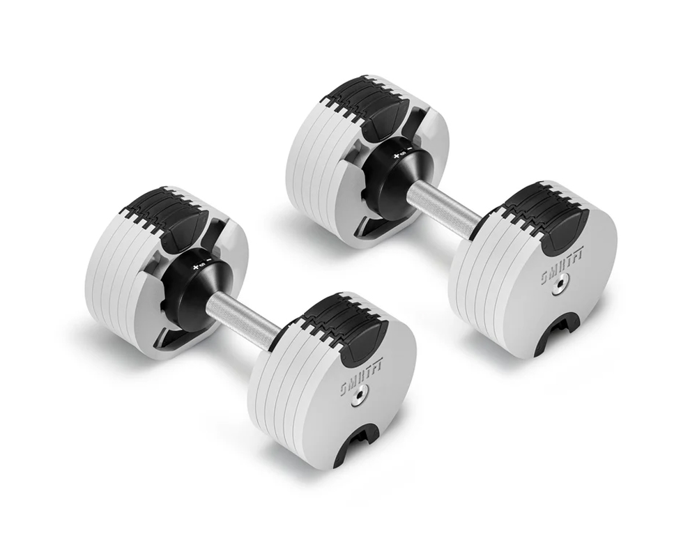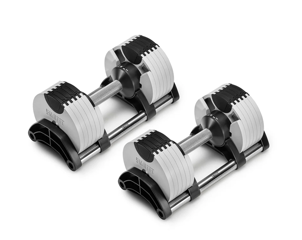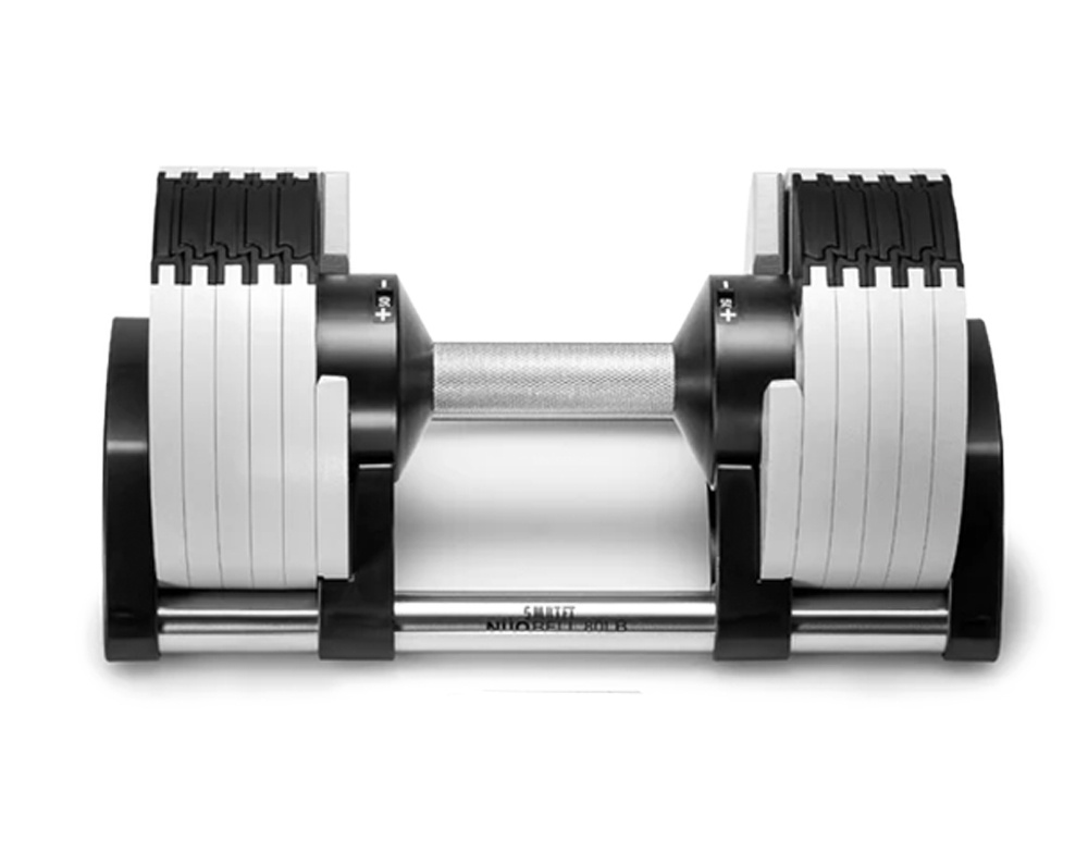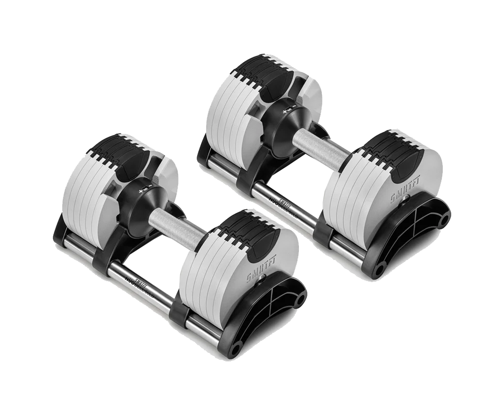 SMRTFT NÜOBELL 50lb Ash Adjustable Dumbbells Set give you the convenience of all-in-one adjustable 5-50lb dumbbells that are easy to use and have superior durability thanks to its machined steel weight plates. This innovative dumbbell set will quickly become your go to favorites.