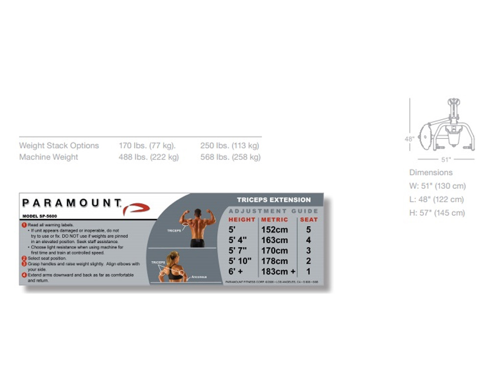 The True Fitness Triceps Extension SP-5600. 5 position seat assembly uses four-bar linkage and gas cylinder assist for quick and easy adjustment. Dual arm assemblies rotate freely to allow full range of motion while accommodating wide range of users. Hand grips self-align during exercise movement for proper ergonomic and biomechanical function while eliminating impingement of the wrist joint. True Fitness Triceps Extension SP-5600 counterbalanced press arm minimizes initial weight load and provides smooth and consistent feel. Contoured back pad angled at 75º for proper ergonomic function and support.