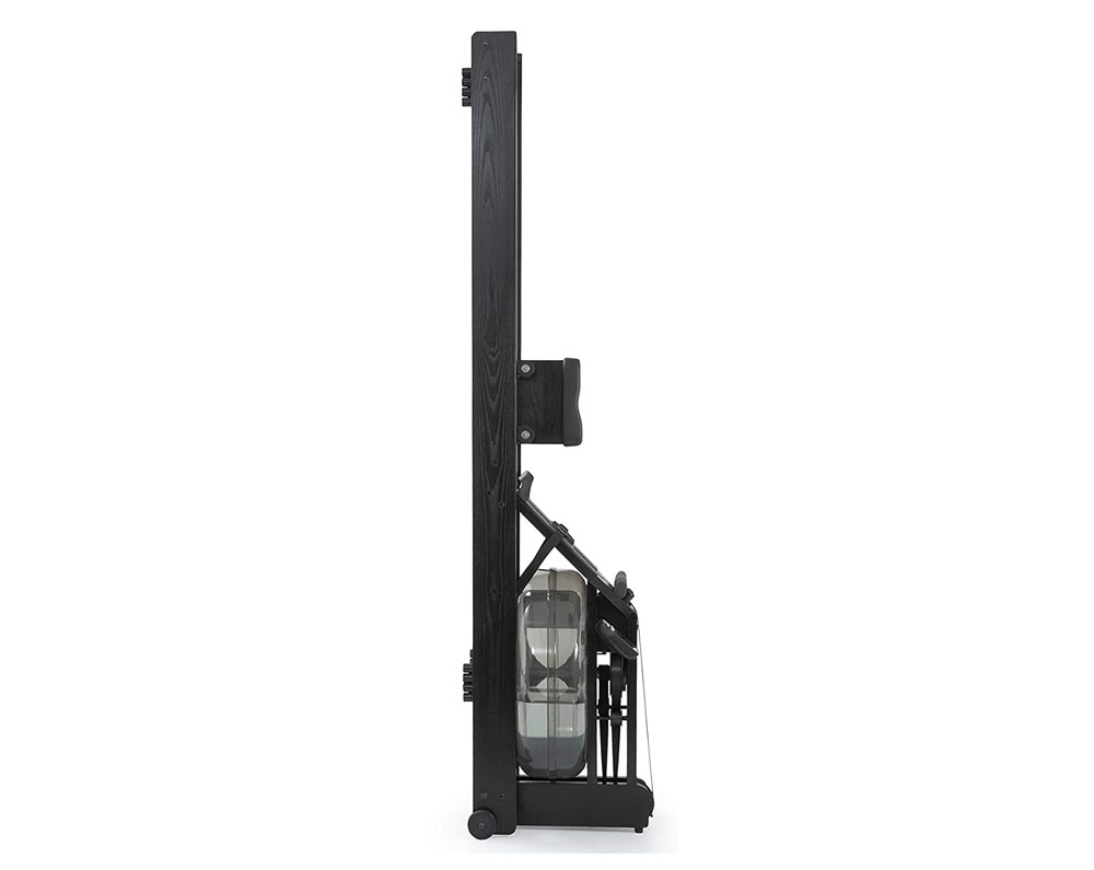 - Space Saving: Stores conveniently upright in about the space of a dining room chair. The WaterRower’s light wooden frame, the positioning of the WaterFlywheel close to the wheels, and the leverage effect provided by the rails, makes lifting almost effortless.